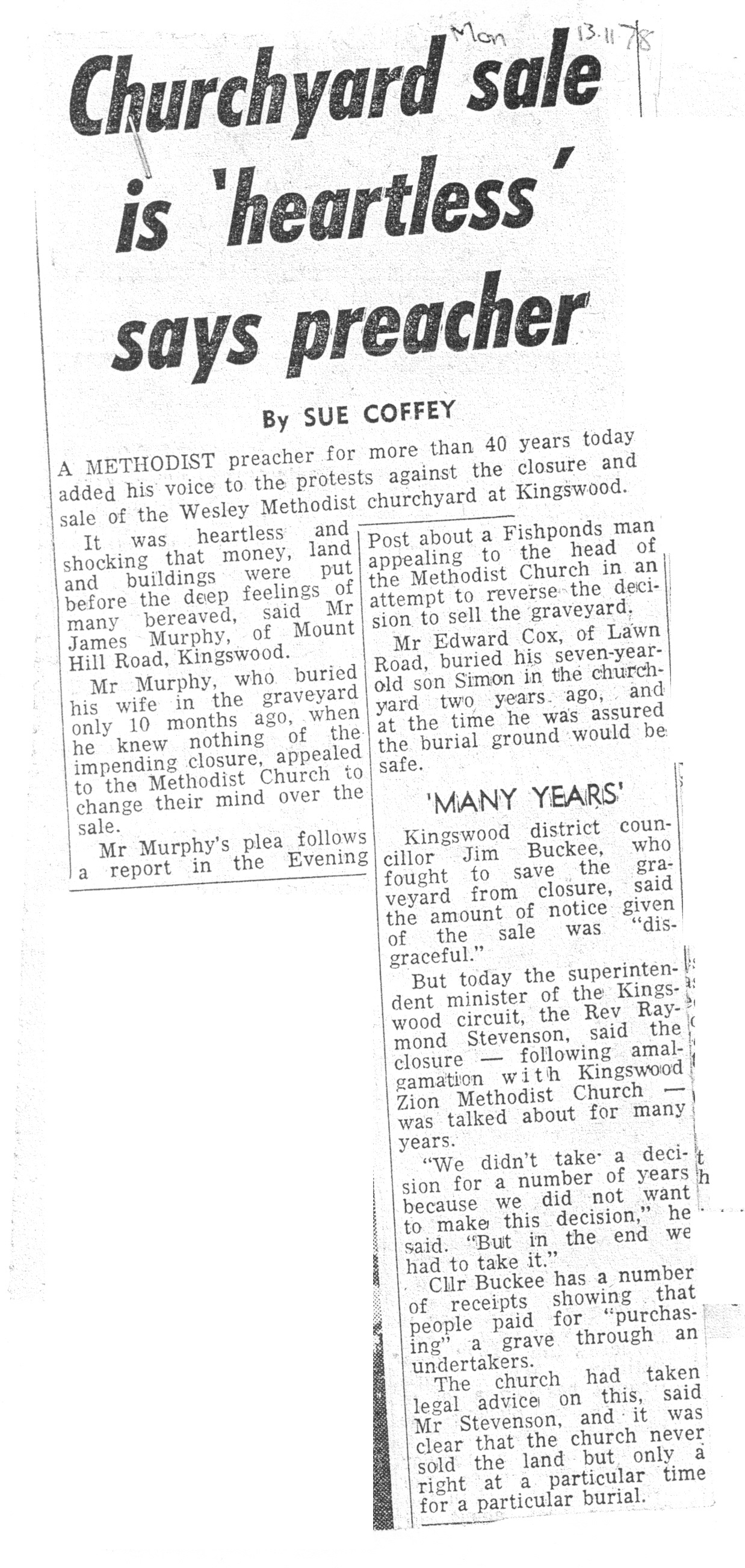- 13 Nov 1978, unknown source (sale of burial ground is heartless)