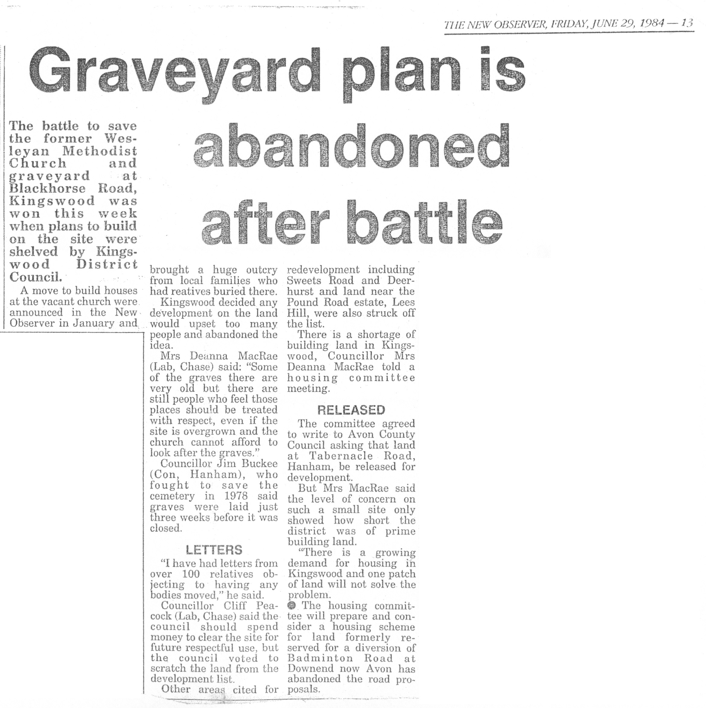 - 29 Jan 1991, Evening Post (opposition to plans for 24 flats on burial ground)