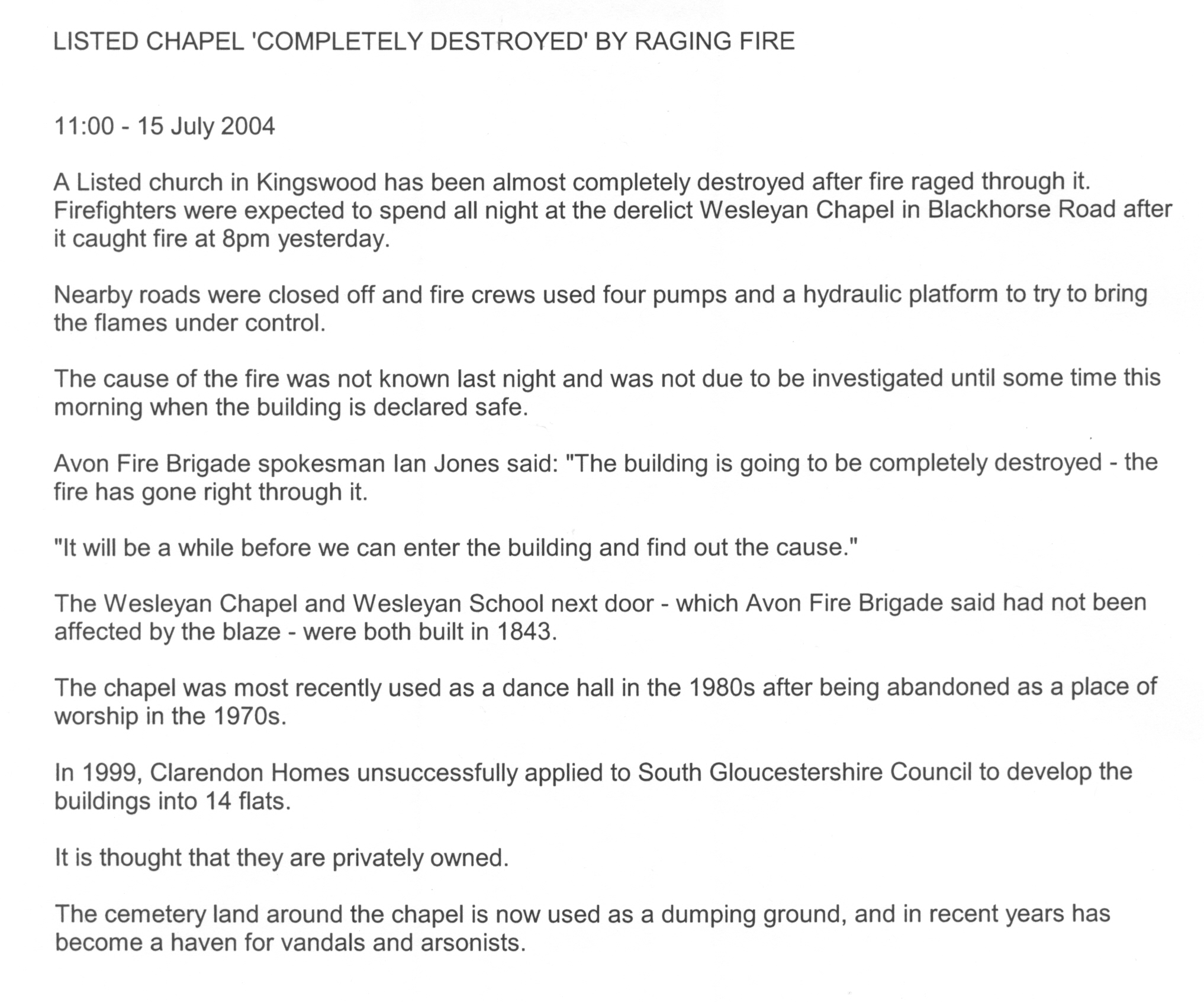 - 26 Jul 2004, Evening Post (letter from a local resident after the Chapel fire)