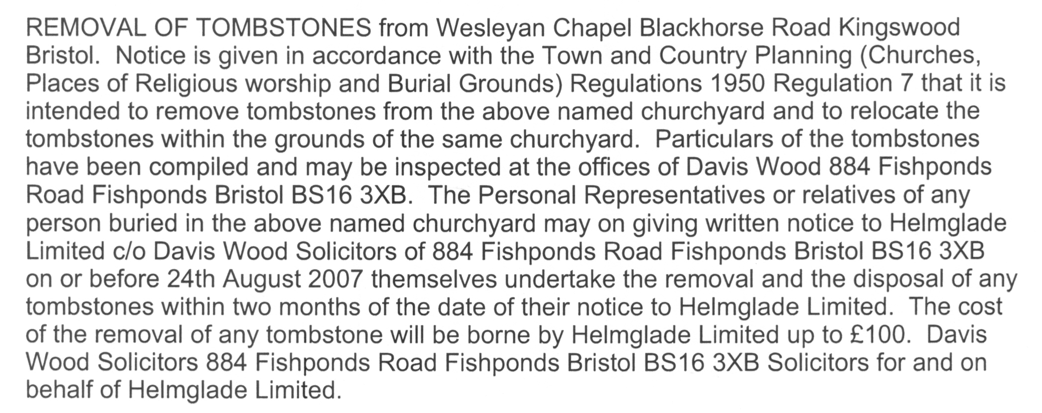 - Early 1979, unknown source (petition to re-open burial ground presented to Methodist Conference)