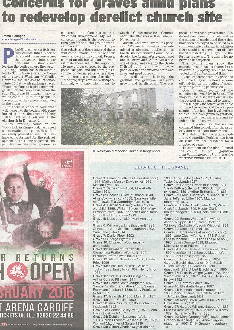 South Gloucestershire Council. The former Wesleyan Methodist Chapel and Burial Ground between Blackhorse Road and Waters Road, Kingswood were (mostly) within the ward I represented. Due to the bizarre way in which boundaries are put on maps over the years and the way in which land is divided up, a small portion of the Burial Ground does, in fact, lie within the boundaries of