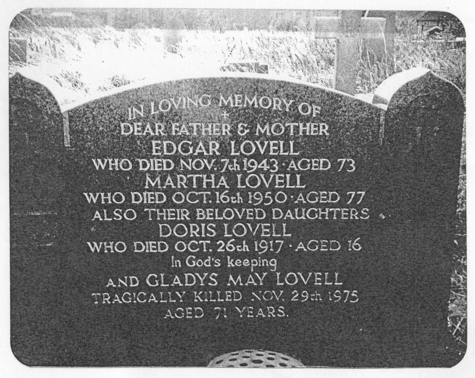 LOVELL gravestone (From photocopy of a photo. Location and date unknown) |